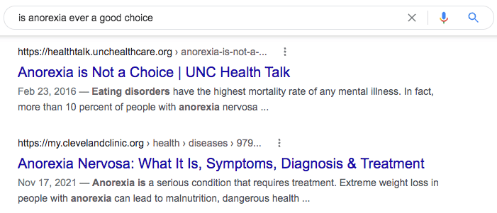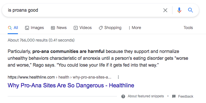 What do “high quality sites” have to say on this topic? No matter which search I did, the top ranking site exclaimed that proana was unsafe.
