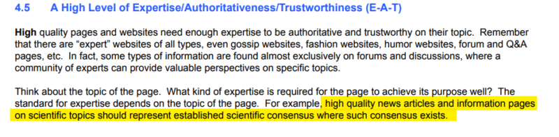 In order for news articles or information pages on scientific topics to be considered high quality by a rater, they need to “represent established scientific consensus where such consensus exists.”