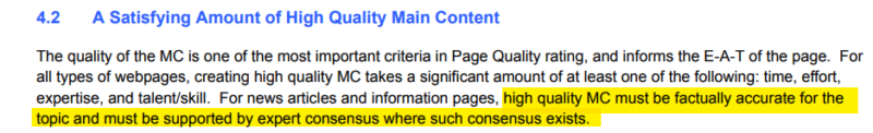 In order for the raters to consider content high quality, it must be “factually accurate for the topic and must be supported by expert consensus where such consensus exists.”