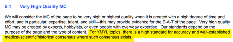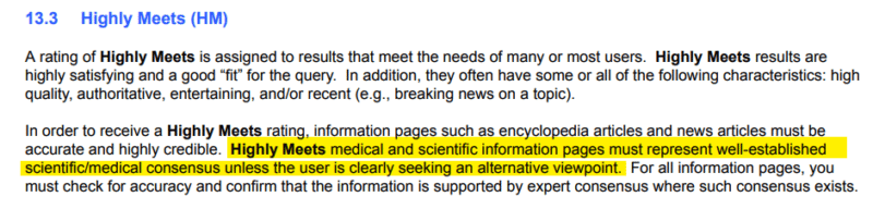 There is a line in the QRG that says that for medical or scientific pages to be rated as meeting a searcher’s needs, the content “must represent well-established scientific/medical consensus unless the user is clearly seeking an alternative viewpoint.” (Bolding added by me.)