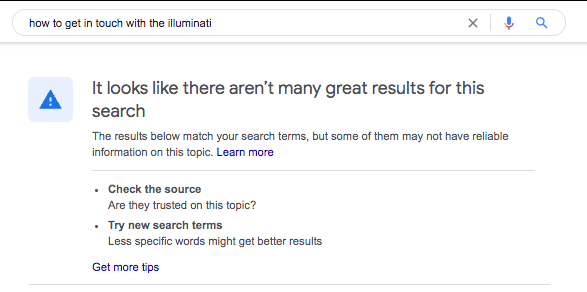 In the example Google gives, the search was [how to get in touch with the Illuminati]. I did this search and did indeed get one of these warnings: