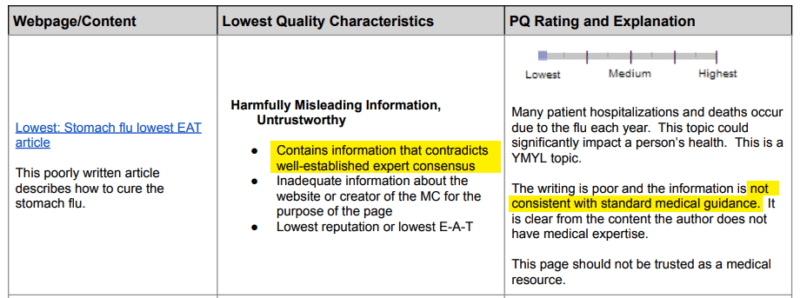 In the most recent update to the QRG, Google stressed in several places that YMYL content should be assessed in terms of whether the topic, or misinformation on the topic has the potential to cause harm. “Health related advice that contradicts well-established expert consensus and could result in serious harm” is to be given the “lowest” rating by raters.