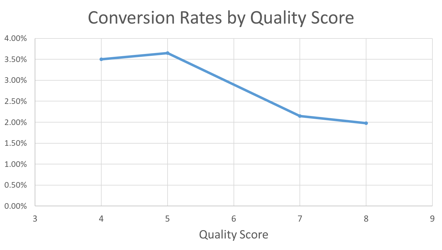 We have a client who specializes in factory parts, and when we graph their conversion rates by Quality Score, we can see that as their Quality Score increases, their conversion rates decrease.