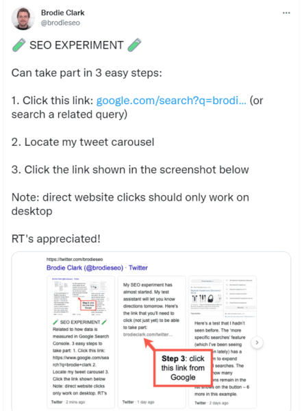 For example, in my BrightonSEO talk on remarketing SEO, I shared an experiment that Brodie Clark (an Australian SEO consultant) did on Twitter.